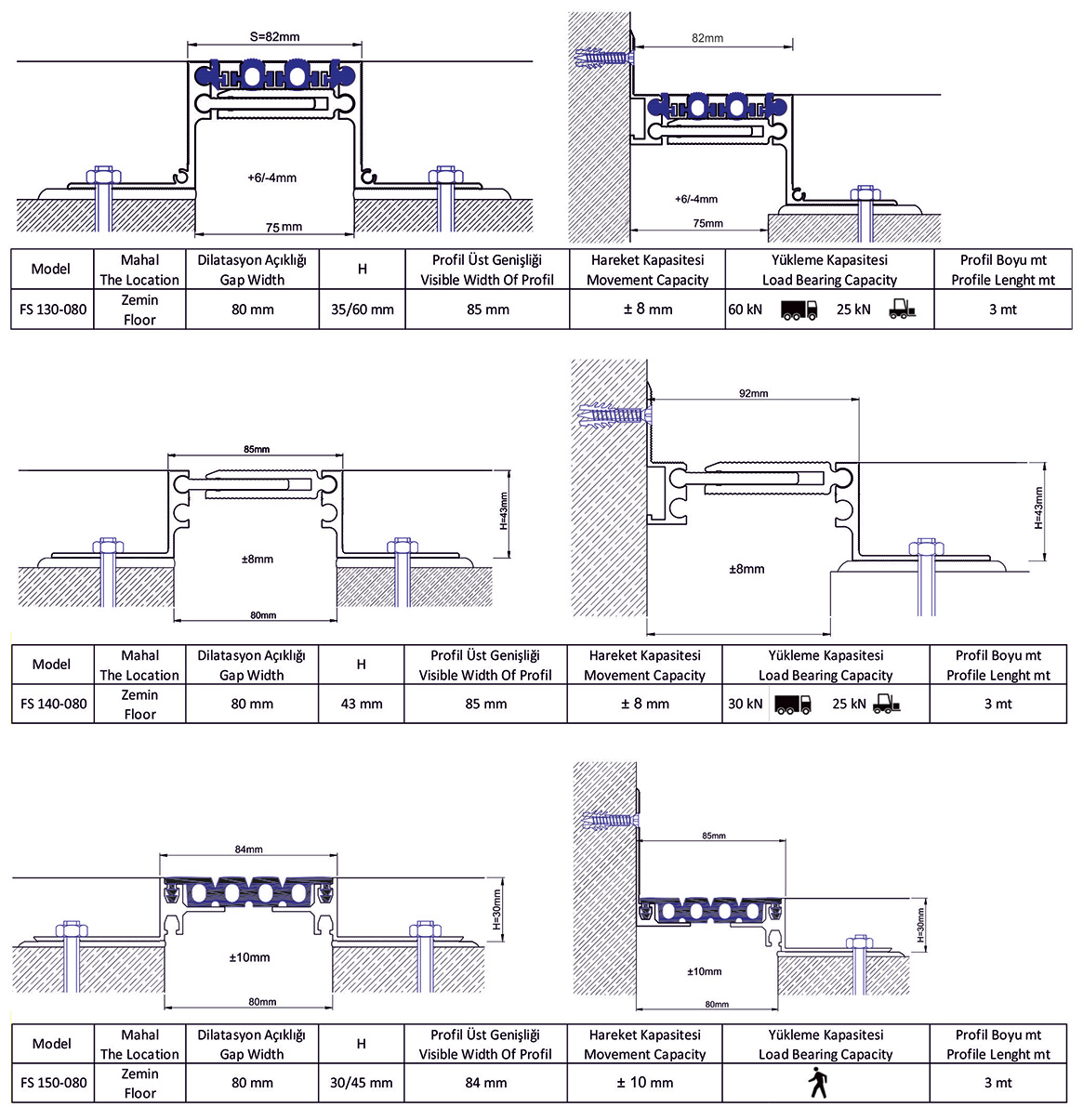 Delinmiş olan alüminyum eklem yüzlerinin standart uzunlukta (10 mm çap delikler.) sabitleme için kullanılır. 3,00 milimetre değiştirilebilir esnek conta DUTRAL yapılır (EPDM). Eklemin genişleme ve daralması, (atmosferik korozyona ve -35 ° C ila + 120 ° C arasındaki sıcaklık değişimlerine garantili olarak dayanıklıdır). Conta 25 metreye kadar olan rulolar halinde mevcuttur. Renkleri: Siyah
