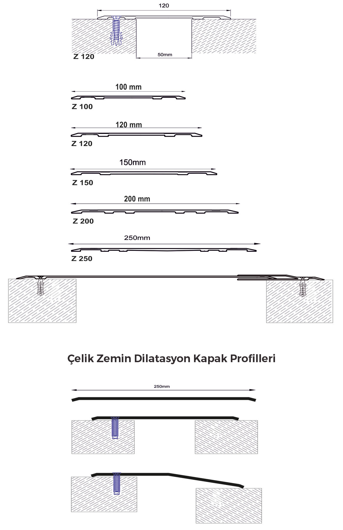100, 120, 150, 200, 250, 300, 350, 400 mm ebatlarında duvar-tavan-zemin kapak dilatasyon profilleridir. Fabrika, depo, iş merkezi, konut, okul, otel, çok katlı otopark, hastane, laboratuvar projelerinde kullanılmaktadır. Sadece aluminyumdan yapılmıştır. Hem iç hem dış mekanda kullanılabilir. Renovasyon ve yeni projelerde tercih edilir.